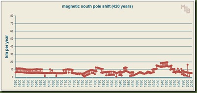 Bem, como parece, o Pólo Sul magnético da terra não está se comportando de forma semelhante ao seu pólo norte oposto. Na verdade, a deriva, ou deslocamento do Pólo Sul, esta é realmente desacelerando! Atualmente só se moveu 3 milhas (5 km) por ano, apenas um décimo da velocidade de mudança do norte!